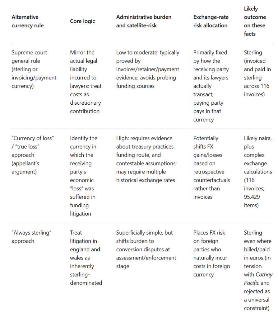 The table below contrasts (i) the rule the supreme court adopted with (ii) the “currency of loss” approach argued for by the appellant and (iii) an “always sterling” approach that was argued against in Cathay Pacific and rejected in principle. The comparisons are grounded in the reasoning about discretion, proportionality, and the risks of collateral inquiries.